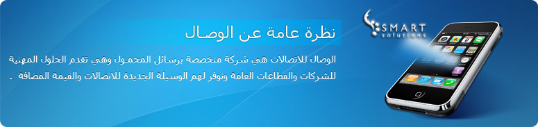 نحن شركة متخصصة بالرسائل النصية القصيرة للهواتف المحمولة ونقدم الحلول المهنية والمبتكرة لكافة خدمات الشركات القطاعات العامة والخاصة ، حيث نقدم لهم الوسيلة الجديدة والمميزة لخدمات الاتصالات ذات القيمة المضافة .
